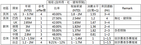最後我把收到的 offer、稅收和消費水平以地區為劃分一個比較,讓大家有一個比較清楚的概念。(以下都以NTD為比較水準)