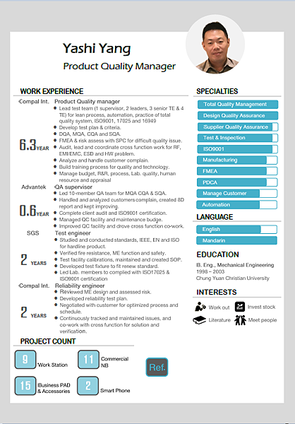 中原機械學士,工作是 QA 相關的,挑戰高階主管,品保相關經驗 11 年,管理經驗 7 年。
